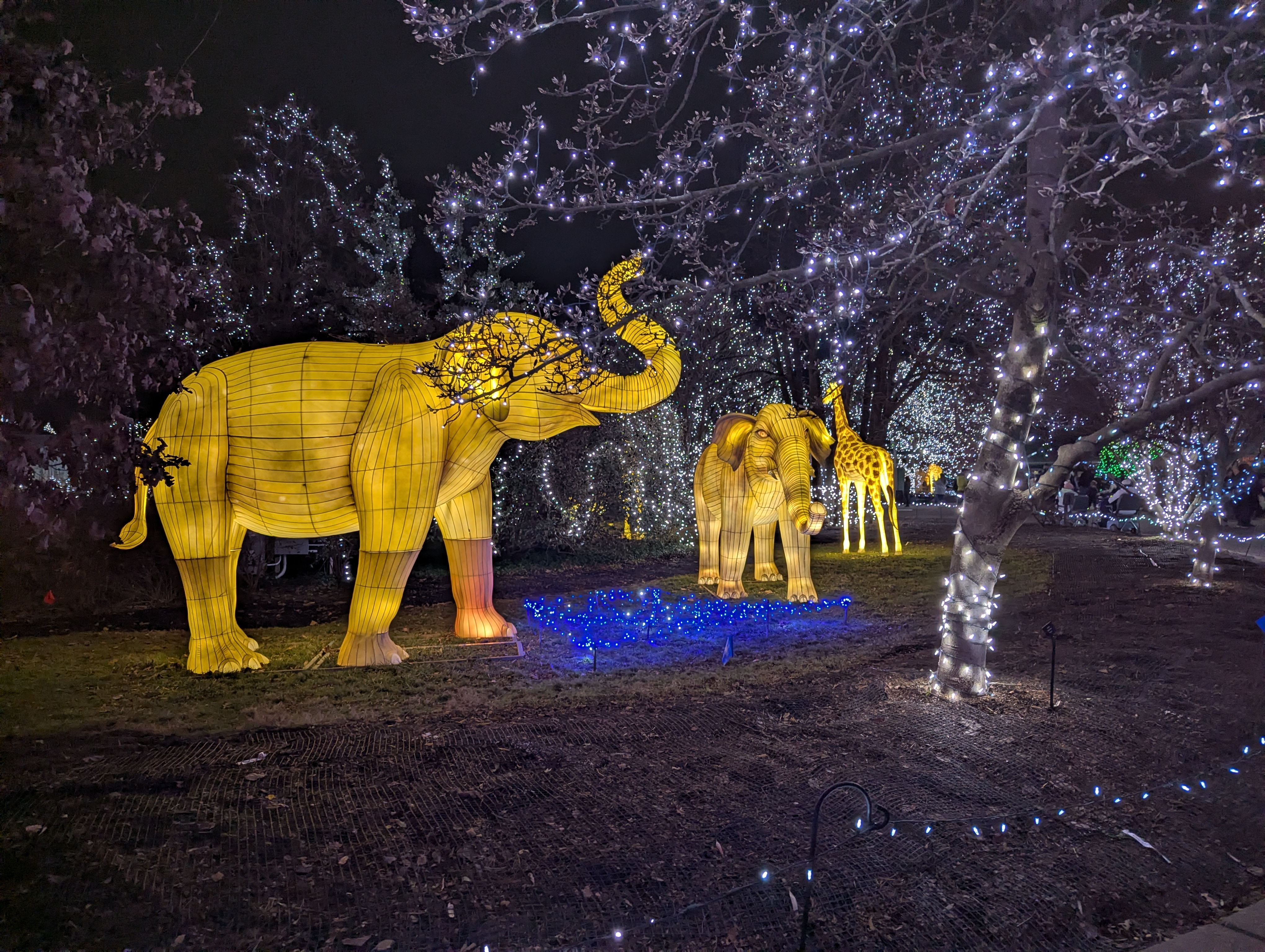 Larger-than-life elephant lanterns light up the pathway