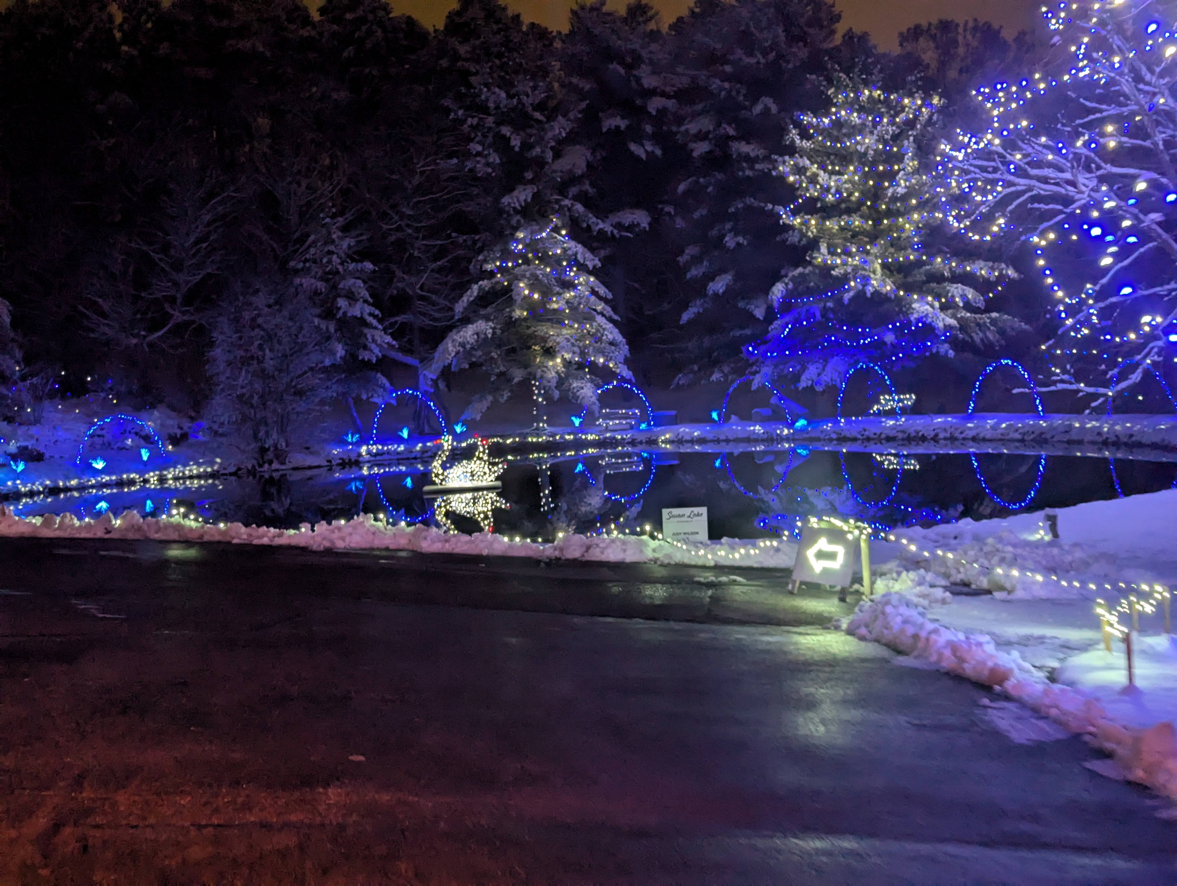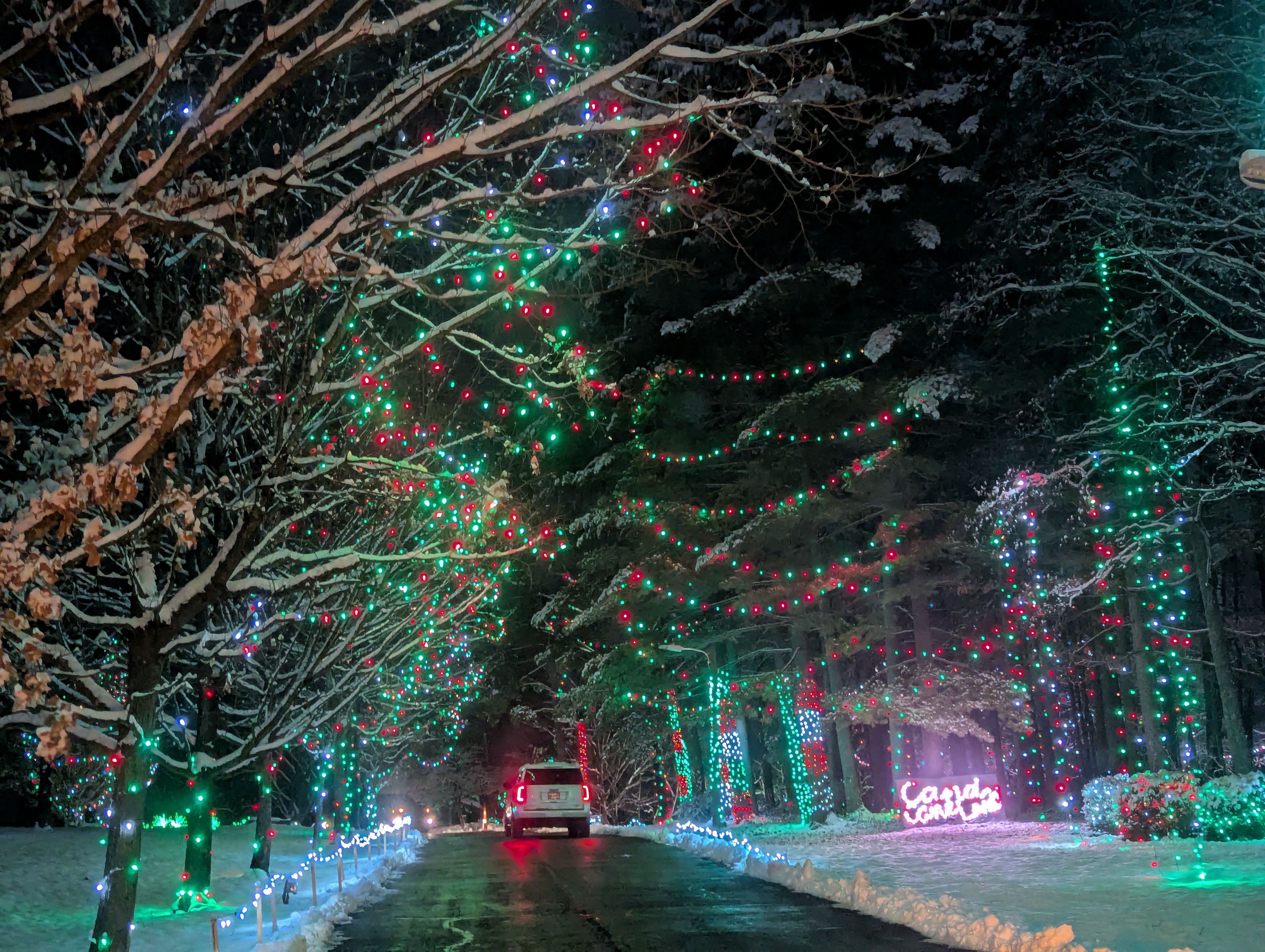 The drive is genuinely beautiful. You wind through the park, taking in the combination of holiday lights and permanent art installations. It’s the kind of experience where you find yourself stopping (when safe) just to take it all in. The sculptures lit up against the night sky, surrounded by twinkling lights, creates something special.